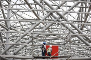 Actualmente, se desarrollan labores de pintura esmalte alquídico en la estructura metálica, además de la instalación de canaletas y tubería eléctrica interior. De manera paralela, se ejecutan los trabajos correspondientes a la tubería de la red contra incendios interior y la instalación de pisos en cerámica y porcelanato, junto con el esmaltado de superficies.